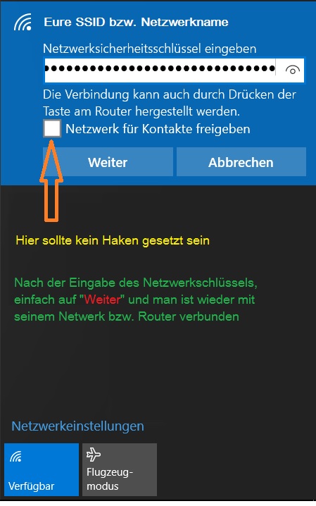 Netzwerkschlüssel ändern der nicht mehr sichtbar gemacht werden kann unter Windows 10Netzwerkschlüssel ändern der nicht mehr sichtbar gemacht werden kann unter Windows 10: Hallo an Alle, beim Austausch der Fritzbox musste erstmalig derNetzwerkschlüssel der neuen Fritzbox eingegeben werden, jedoch hat sich der Laptop nicht mit dem Internet verbunden. Unter anderen Betriebssystemen haben wir aber eine Verbindung zur neuen Fritzbox schaffen können. Unter Windows 10... |